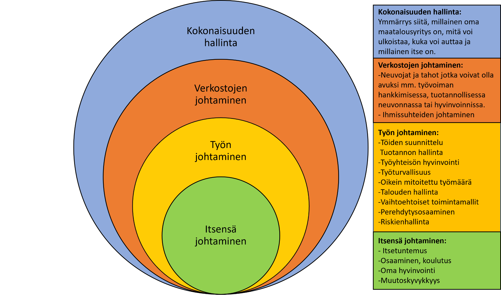 Mitä mielenterveyttä suojaava maatalousyrityksen johtaminen sitten on? Aihe jää usein termin tasolle, jonka vuoksi tässä projektissa avattiin termiä. Kokonaisvaltainen maatalousyrityksen johtamisen hallinta muodostuu kolmesta kokonaisuudesta – itsensä johtamisesta, työn johtamisesta ja verkostojen johtamisesta.