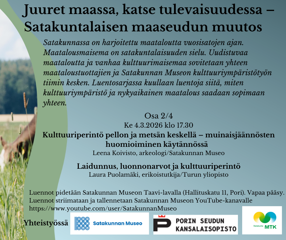 Satakunnassa on harjoitettu maataloutta vuosisatojen ajan. Maatalousmaisema on satakuntalaisuuden sielu. Uudistuvaa maataloutta ja vanhaa kulttuurimaisemaa sovitetaan yhteen maataloustuottajien ja Satakunnan Museon kulttuuriympäristötyön tiimin kesken. Luentosarjassa kuullaan luentoja siitä, miten kulttuuriympäristö ja nykyaikainen maatalous saadaan sopimaan yhteen.