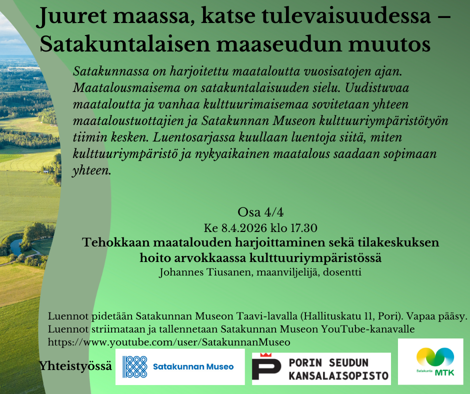 Satakunnassa on harjoitettu maataloutta vuosisatojen ajan. Maatalousmaisema on satakuntalaisuuden sielu. Uudistuvaa maataloutta ja vanhaa kulttuurimaisemaa sovitetaan yhteen maataloustuottajien ja Satakunnan Museon kulttuuriympäristötyön tiimin kesken. Luentosarjassa kuullaan luentoja siitä, miten kulttuuriympäristö ja nykyaikainen maatalous saadaan sopimaan yhteen.