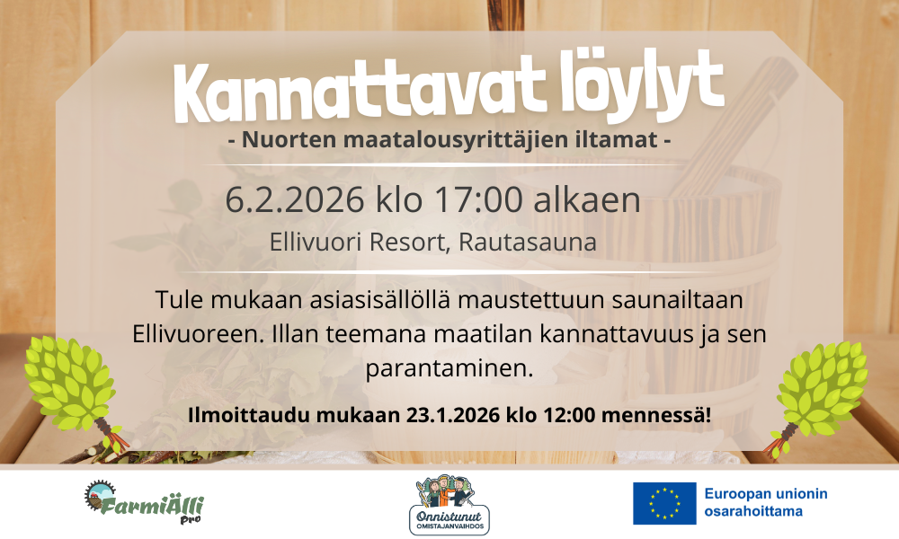 MTK-Pirkanmaan FarmiÄlli Pro - ja MTK-Satakunnan Onnistunut omistajanvaihdos -hanke järjestävät nuorille maatalousyrittäjille asiasisällöllä maustetun saunaillan 6.2.2026 klo 17 alkaen Ellivuoren Rautasaunalla.