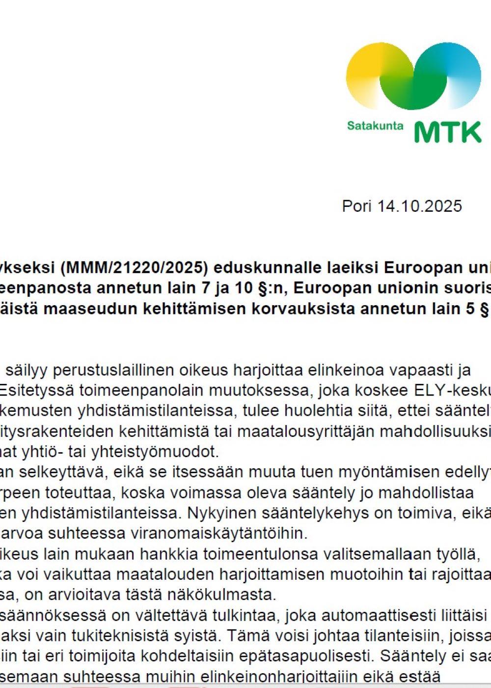 Lausunto luonnoksesta hallituksen esitykseksi (MMM/21220/2025) eduskunnalle laeiksi Euroopan unionin ja kansallisten maatalouden tukien toimeenpanosta annetun lain 7 ja 10 §:n, Euroopan unionin suorista viljelijätuista annetun lain 6 ja 8 §:n ja eräistä maaseudun kehittämisen korvauksista annetun lain 5 §:n muuttamisesta.