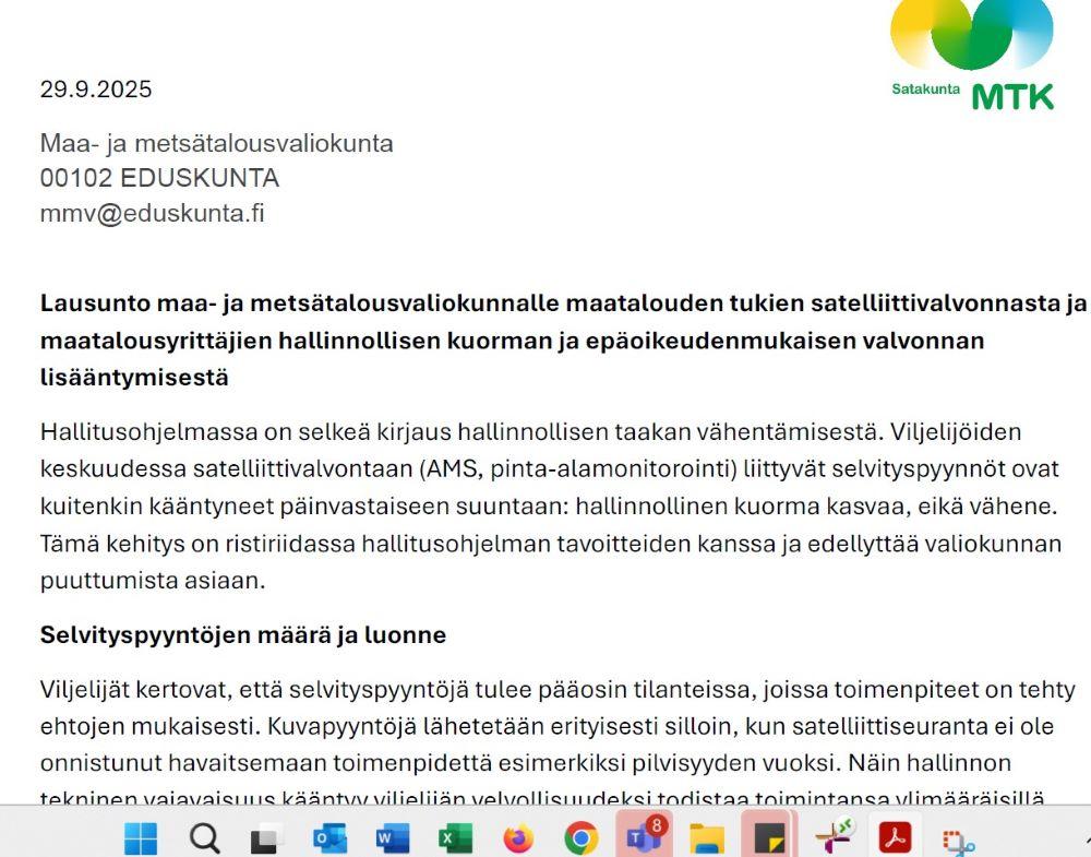 Lausunto maa- ja metsätalousvaliokunnalle maatalouden tukien satelliittivalvonnasta ja maatalousyrittäjien hallinnollisen kuorman ja epäoikeudenmukaisen valvonnan lisääntymisestä