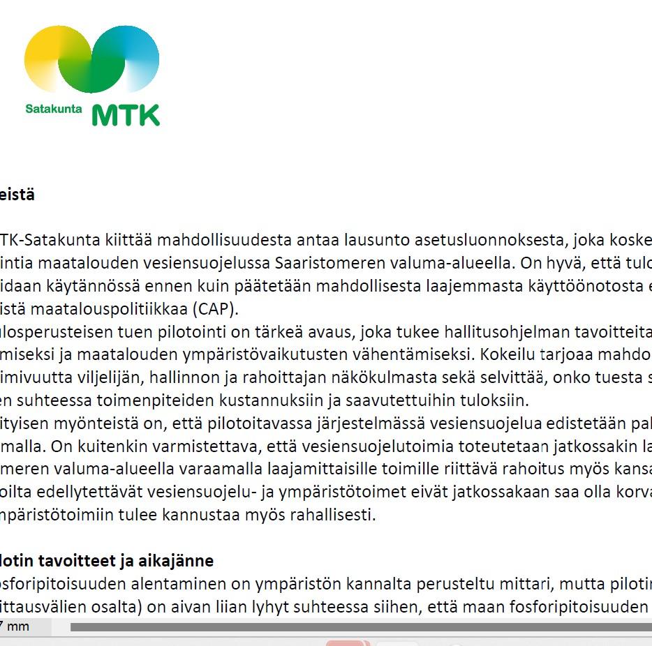 MTK-Satakunta kiittää mahdollisuudesta antaa lausunto asetusluonnoksesta, joka koskee tulosperusteisen tuen pilotointia maatalouden vesiensuojelussa Saaristomeren valuma-alueella. On hyvä, että tulosperusteista rahoitusta pilotoidaan käytännössä ennen kuin päätetään mahdollisesta laajemmasta käyttöönotosta esimerkiksi osana EU:n yhteistä
