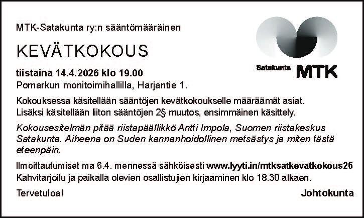 MTK-Satakunta ry:n kevätkokous 14.4.2026 klo 19.00