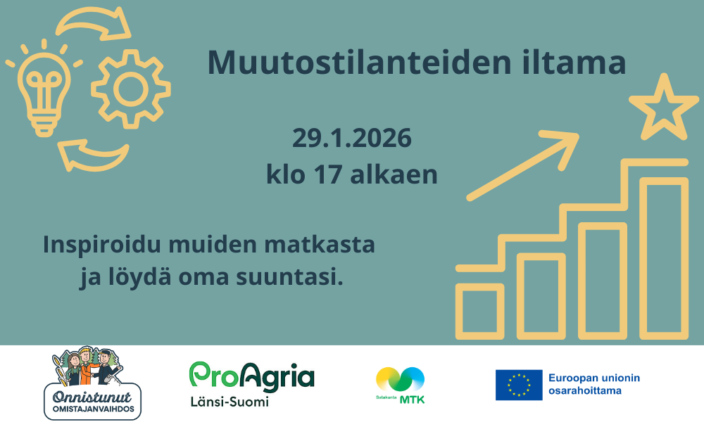ProAgria Länsi-Suomen Draivi -hanke ja MTK-Satakunnan Onnistunut omistajanvaihdos -hanke kutsuvat yrittäjät ja maaseudun toimijat inspiroivaan iltamaan Poriin keskiviikkona 29.1.2026 klo 17.00 alkaen.