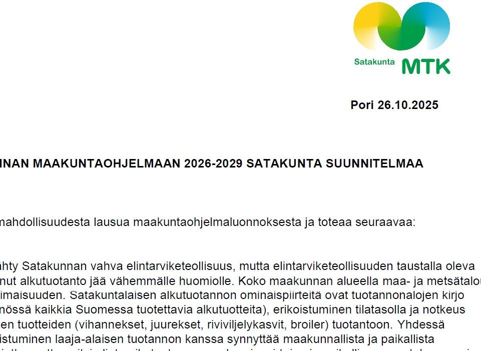 MTK-Satakunta kiittää mahdollisuudesta lausua maakuntaohjelmaluonnoksesta ja toteaa seuraavaa: Ohjelmassa on hyvin nähty Satakunnan vahva elintarviketeollisuus, mutta elintarviketeollisuuden taustalla oleva monialainen ja erikoistunut alkutuotanto jää vähemmälle huomiolle. Koko maakunnan alueella maa- ja metsätalous luovat paikallisen elinvoimaisuuden. Satakuntalaisen alkutuotannon ominaispiirteitä ovat tuotannonalojen kirjo (täällä tuotetaan käytännössä kaikkia Suomessa tuotettavia alkutuotteita), erikoistuminen tilatasolla ja notkeus erikoisosaamista vaativien tuotteiden (vihannekset, juurekset, riviviljelykasvit, broiler) tuotantoon. Yhdessä osaamista vaativa rrikoistuminen laaja-alaisen tuotannon kanssa synnyttää maakunnallista ja paikallista elinvoimaa turvaamaan jatkuvuutta paitsi elintarviketuotannon raaka-ainevirtoina ja paikallisena asutuksena eri puolilla maakuntaa.