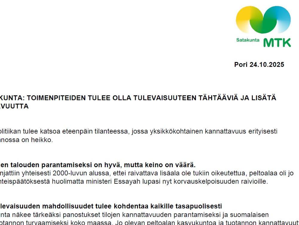 ​​​​​​MTK-SATAKUNTA: TOIMENPITEIDEN TULEE OLLA TULEVAISUUTEEN TÄHTÄÄVIÄ JA LISÄTÄ KANNATTAVUUTTA