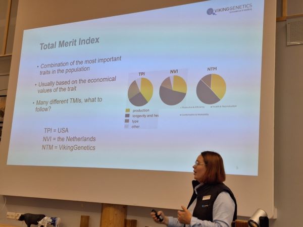Viking Geneticsin jalostusasiantuntija Katariina Hägg  esitteli vieraillemme mm. NTM järjestelmää (Nordic Total Merit , jalostusarvo-ohjelmaa, jossa yhdistetään useita eri ominaisuuksia yhdeksi indeksiksi).