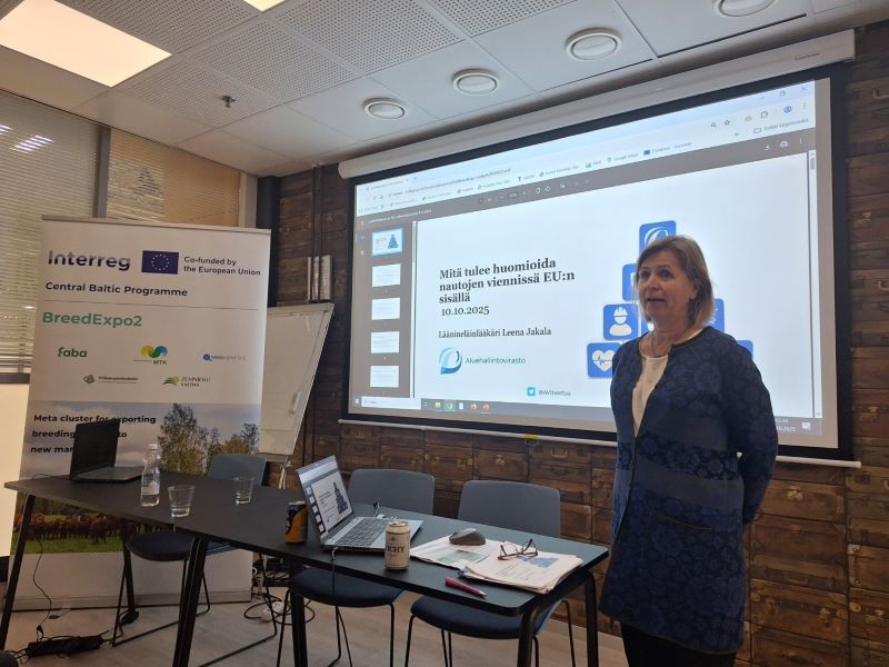 Läänineläinlääkäri Leena Jakala Sisä-Suomen AVI:sta piti esitelmän Mitä tulee huomioida nautojen viennissä EU:n sisällä.